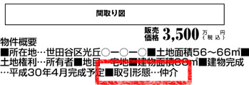 不動産広告には取引形態が仲介とあります。これは、この建物を建てた不動産業者がこの広告の不動産会社に仲介を依頼したケースなります。この場合、広告を掲載した不動産業者が、売り手の会社の間に立って調整しますので、仲介手数料が発生します。